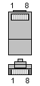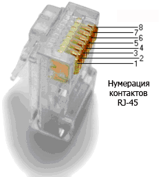 Для обжима сетевого кабеля используются стандартные разъемы RJ-45, которые в зависимости от вида "витой пары" бывают экранированными и неэкранированными, так же различают разъёмы для одножильных или многожильных "витых пар". Конструктивно можно выделить составные разъёмные, выполненные со вставками и монолитные. Вставки являются направляющими, для проводников и упрощают заправку кабеля, но с точки зрения надёжности они уступают монолитным вариантам. Нумерация контактов разъёма RJ-45 представлена на рисунке ниже.